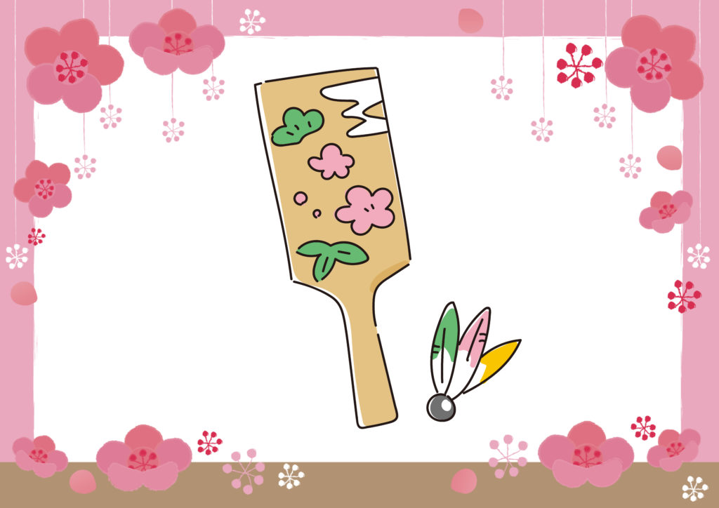 羽根突きは、日本のお正月に行われてきた伝統的な遊びです。羽子板という取っ手のついたヘラのような板で、古くは無患子(むくろじ)という植物の種子に鳥の羽を数枚差し込んで作った羽子という玉をついて遊びます。
